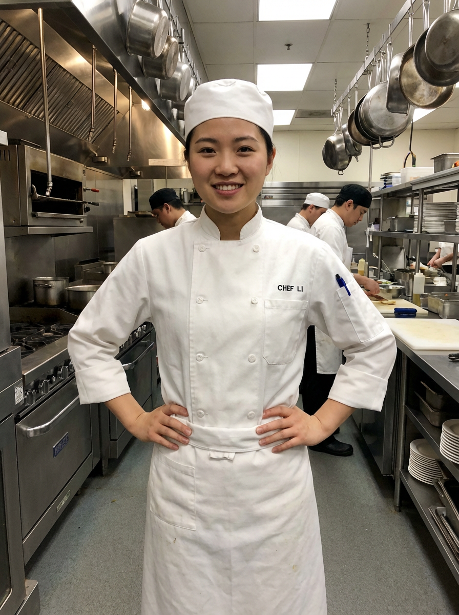 model as professional chef, crisp white chef coat and toque, confident culinary expert expression, commercial kitchen background