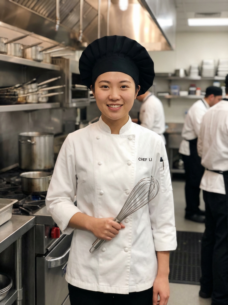 model as professional chef, crisp white chef coat and toque, confident culinary expert expression, commercial kitchen background