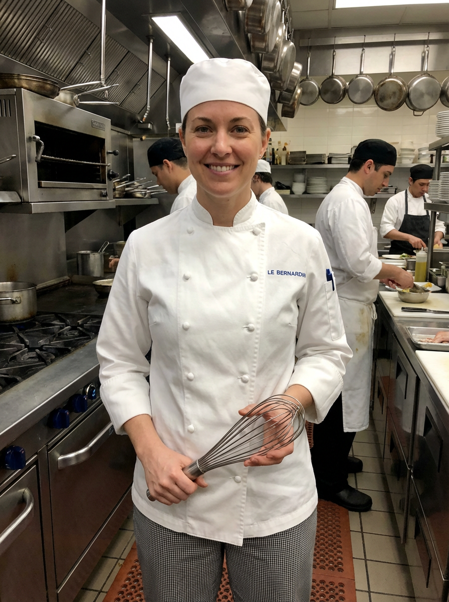 model as professional chef, crisp white chef coat and toque, confident culinary expert expression, commercial kitchen background