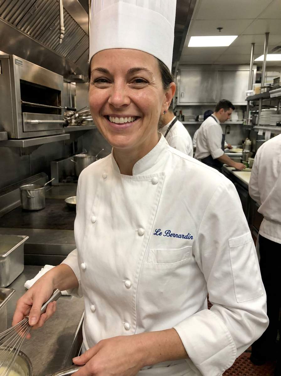 model as professional chef, crisp white chef coat and toque, confident culinary expert expression, commercial kitchen background