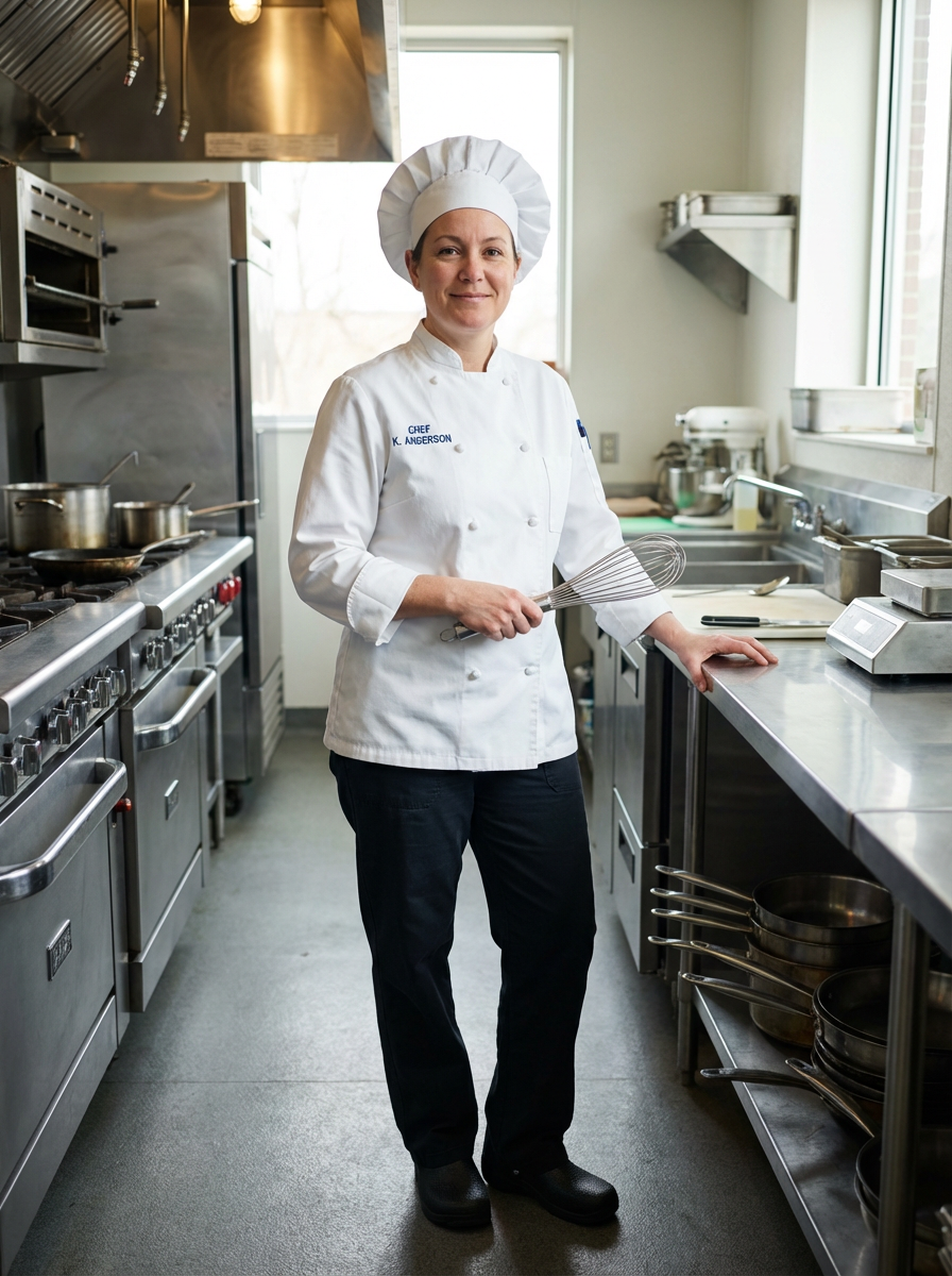 model as professional chef, crisp white chef coat and toque, confident culinary expert expression, commercial kitchen background