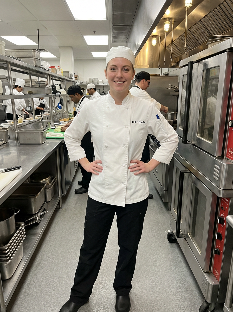 model as professional chef, crisp white chef coat and toque, confident culinary expert expression, commercial kitchen background
