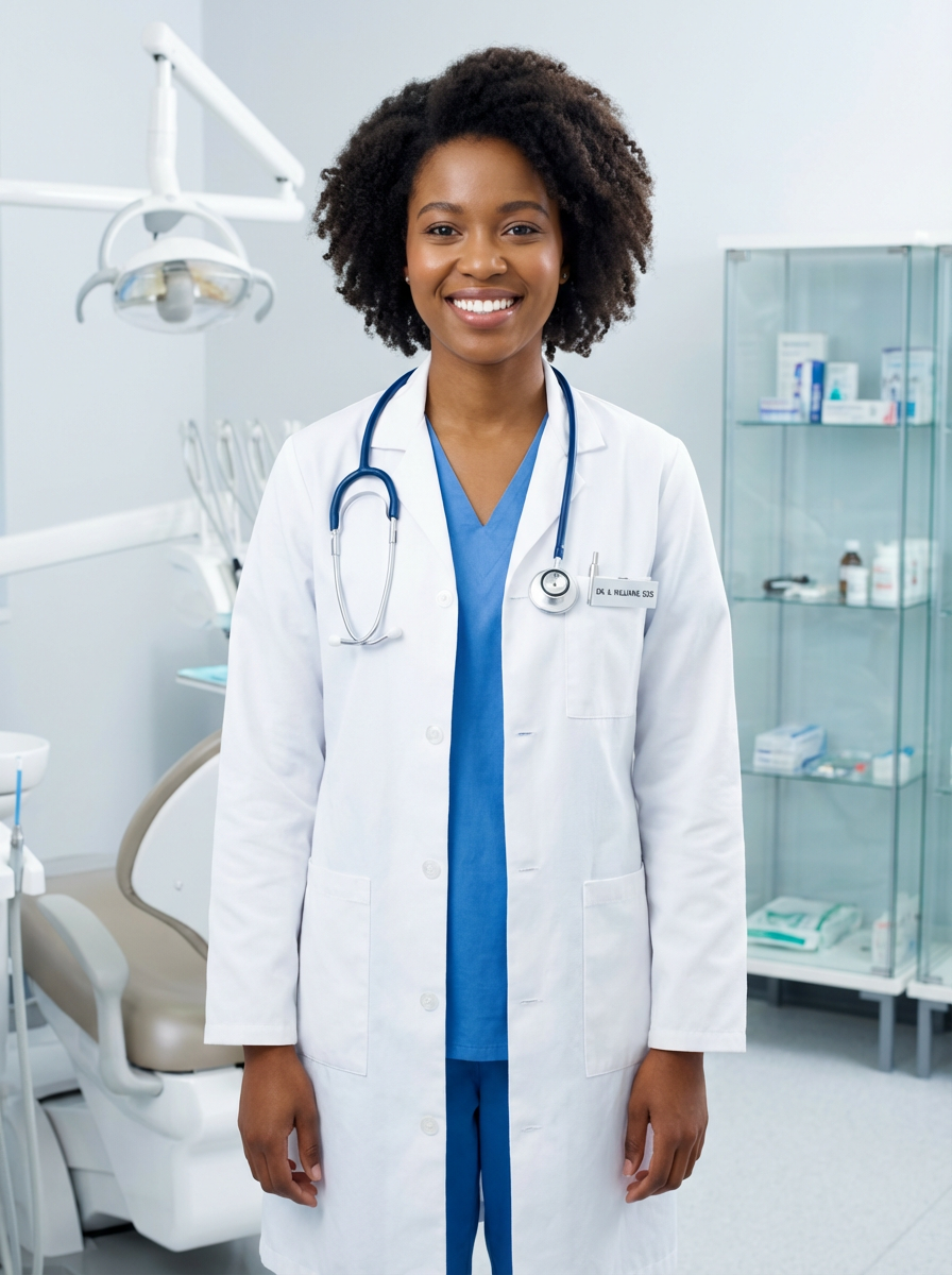 model as professional dentist, white dental coat, perfect smile showing healthy teeth, modern dental office background