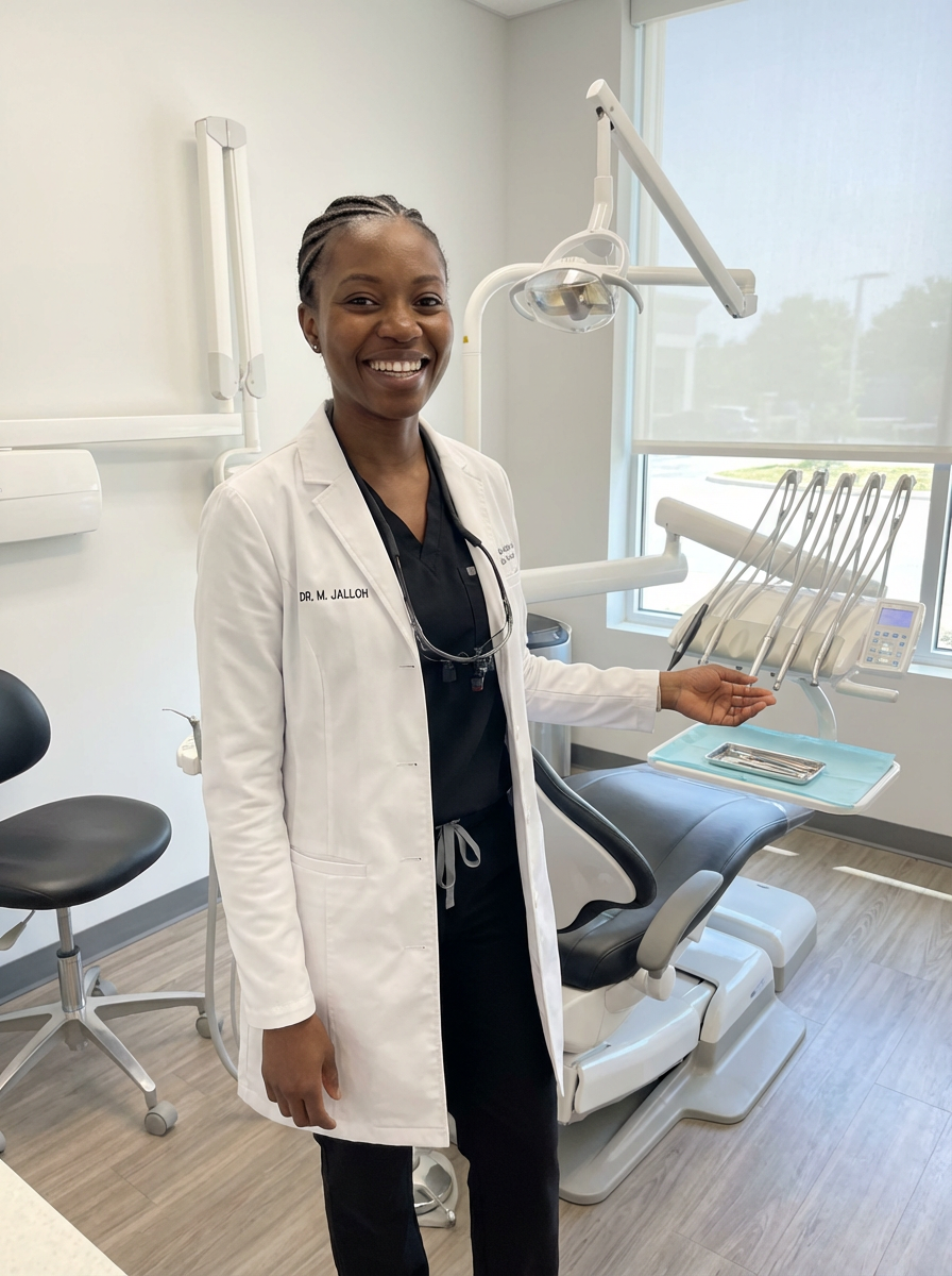 model as professional dentist, white dental coat, perfect smile showing healthy teeth, modern dental office background