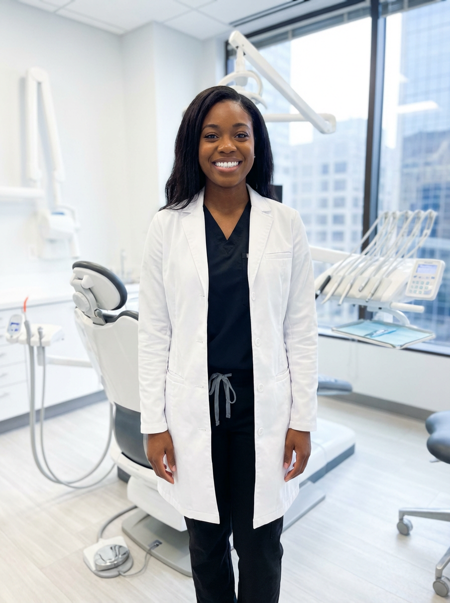 model as professional dentist, white dental coat, perfect smile showing healthy teeth, modern dental office background