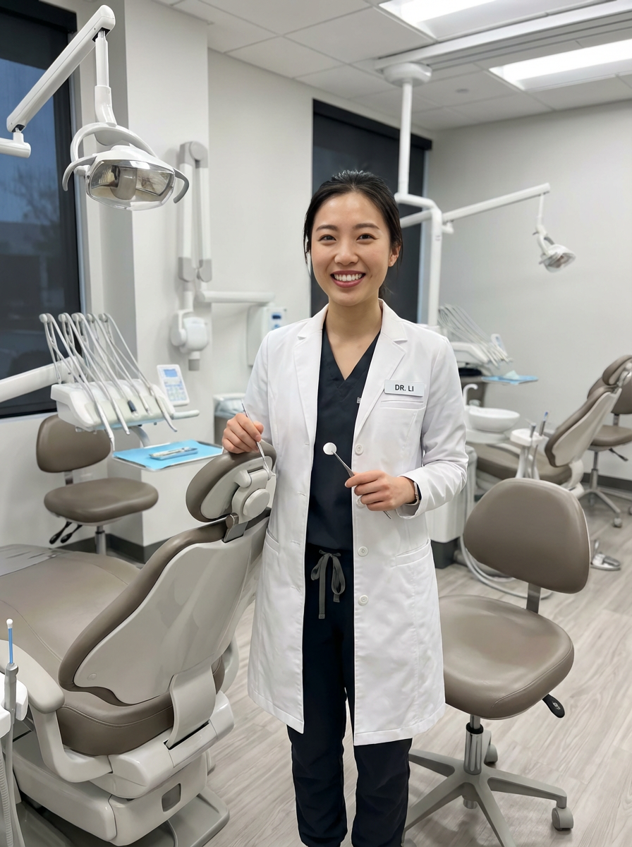 model as professional dentist, white dental coat, perfect smile showing healthy teeth, modern dental office background