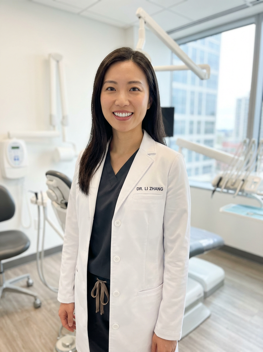 model as professional dentist, white dental coat, perfect smile showing healthy teeth, modern dental office background
