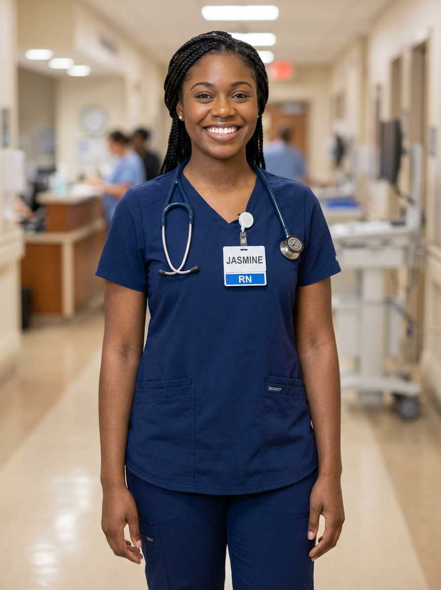 model as professional nurse, wearing clean scrubs, friendly approachable smile, hospital setting background, professional lighting