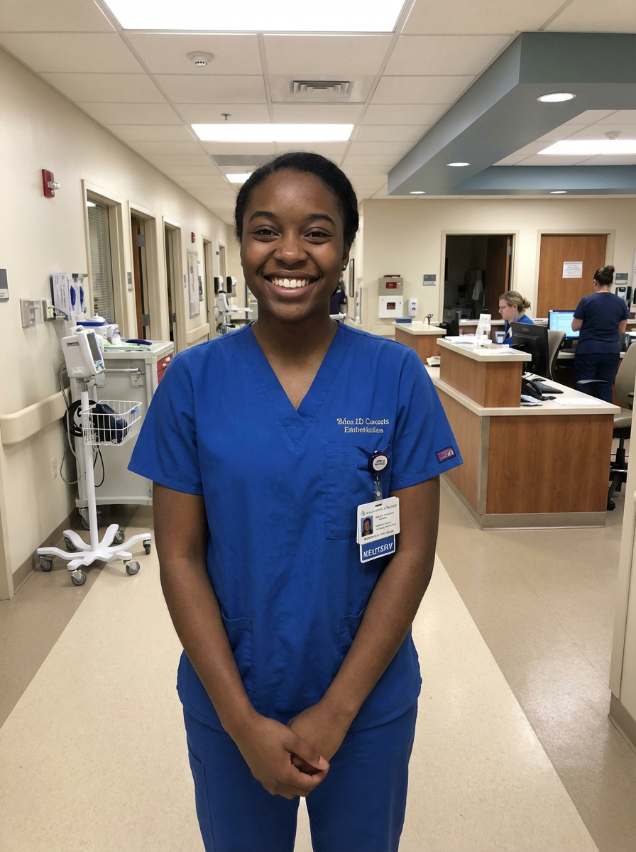 model as professional nurse, wearing clean scrubs, friendly approachable smile, hospital setting background, professional lighting