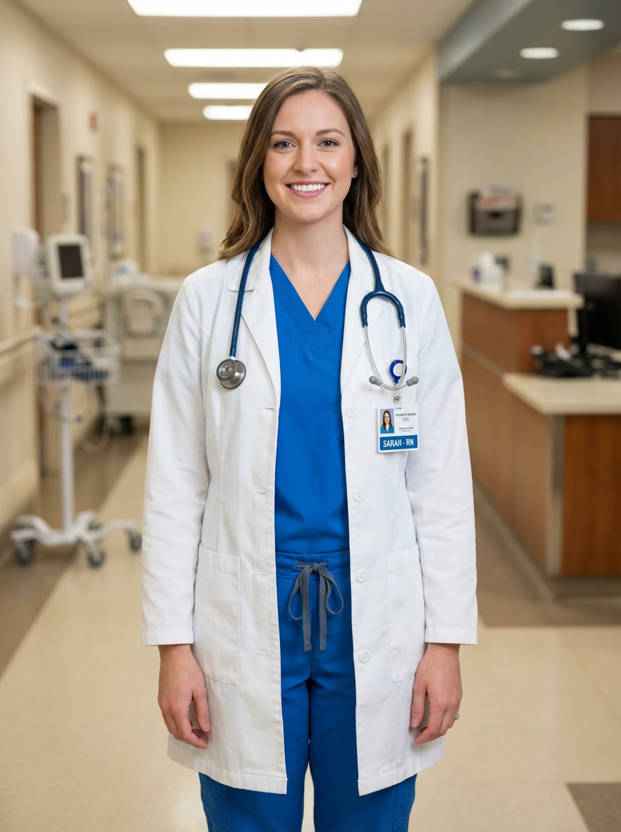 model as professional nurse, wearing clean scrubs, friendly approachable smile, hospital setting background, professional lighting