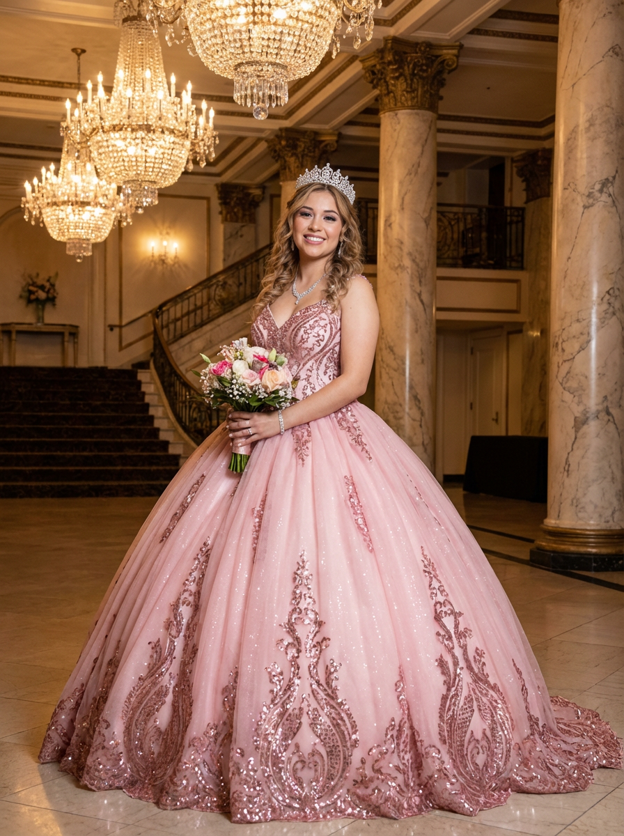 model as quinceanera, stunning ball gown in pink or traditional color, tiara crown, elegant venue, princess moment