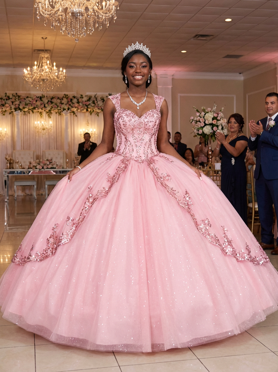 model as quinceanera, stunning ball gown in pink or traditional color, tiara crown, elegant venue, princess moment