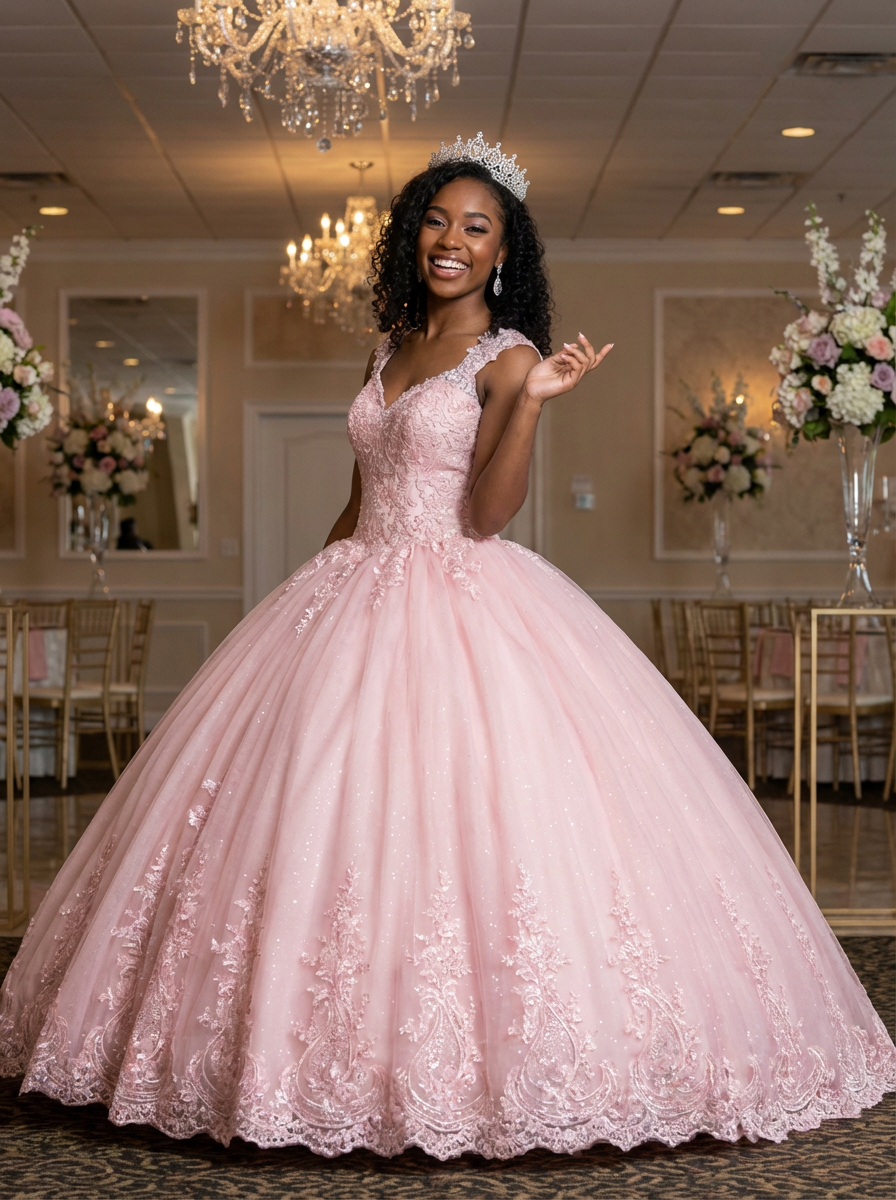 model as quinceanera, stunning ball gown in pink or traditional color, tiara crown, elegant venue, princess moment