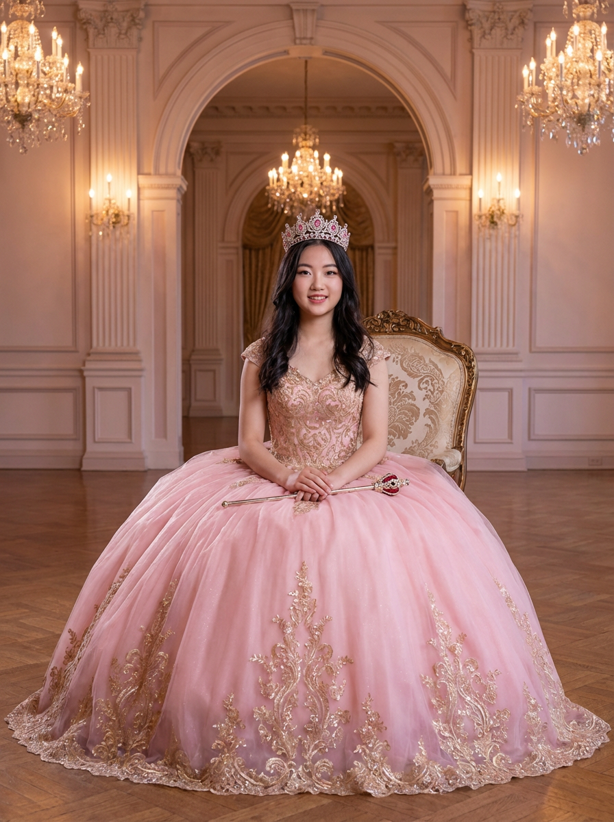 model as quinceanera, stunning ball gown in pink or traditional color, tiara crown, elegant venue, princess moment