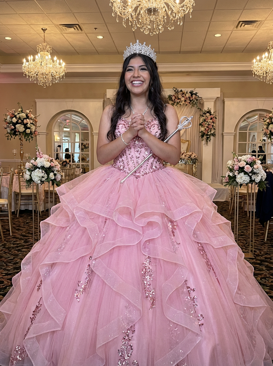model as quinceanera, stunning ball gown in pink or traditional color, tiara crown, elegant venue, princess moment