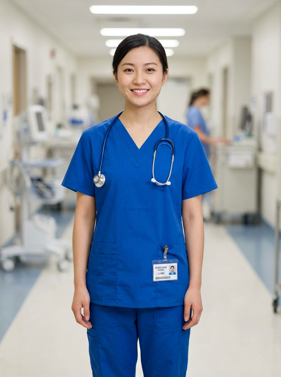model as registered nurse, professional headshot, clean pressed scrubs, hospital corridor background, trustworthy expression