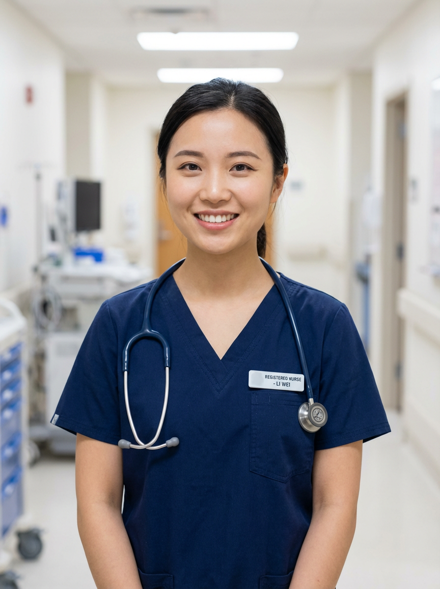 model as registered nurse, professional headshot, clean pressed scrubs, hospital corridor background, trustworthy expression