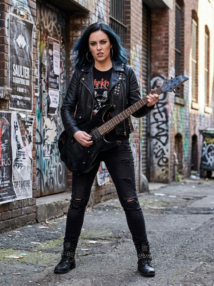 model as rock musician, edgy leather jacket, intense artistic expression, gritty urban background