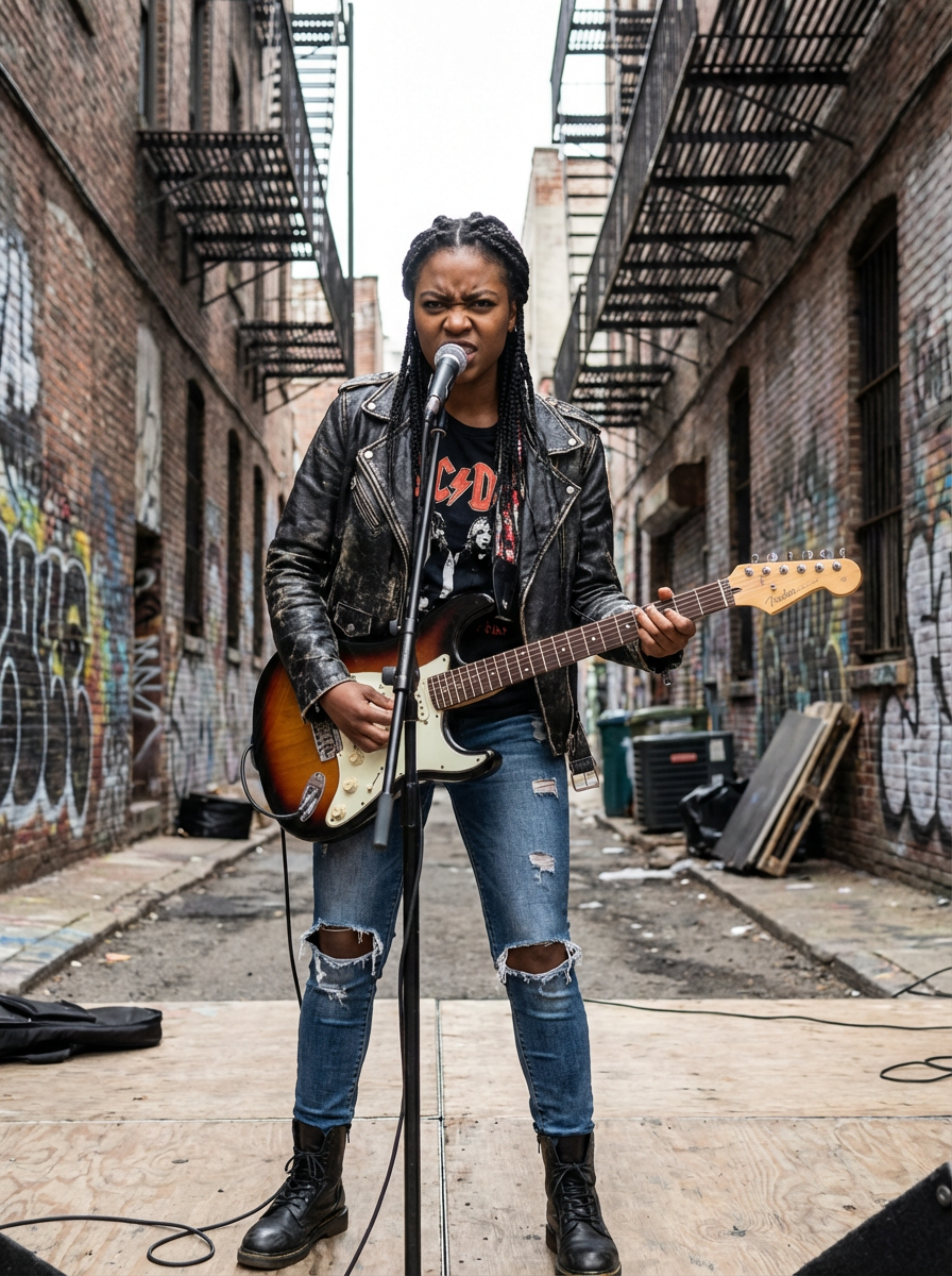 model as rock musician, edgy leather jacket, intense artistic expression, gritty urban background