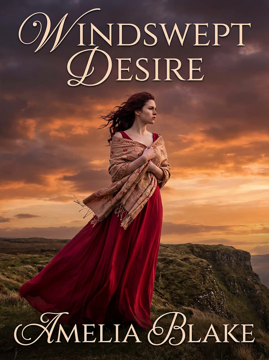 model as romance novel cover, windswept hair, flowing dress , dramatic sky backdrop, passionate aesthetic