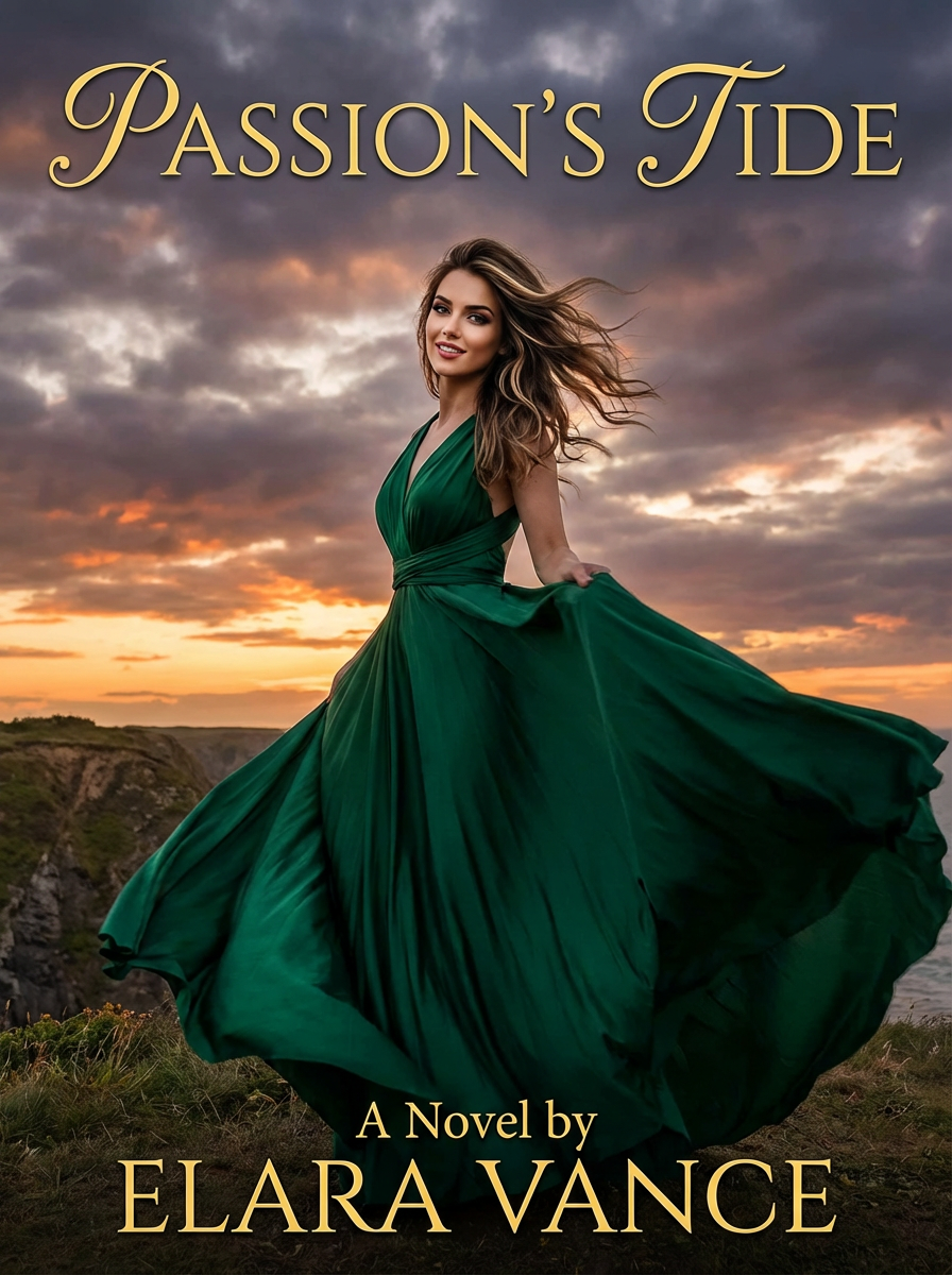 model as romance novel cover, windswept hair, flowing dress , dramatic sky backdrop, passionate aesthetic