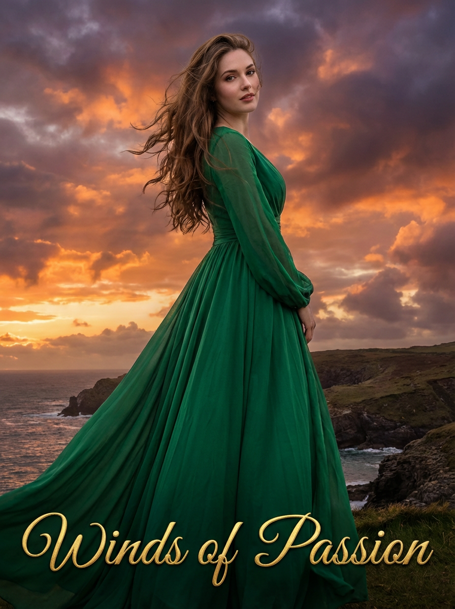 model as romance novel cover, windswept hair, flowing dress , dramatic sky backdrop, passionate aesthetic