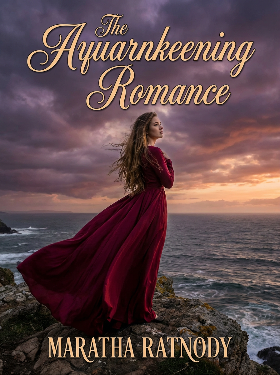 model as romance novel cover, windswept hair, flowing dress , dramatic sky backdrop, passionate aesthetic