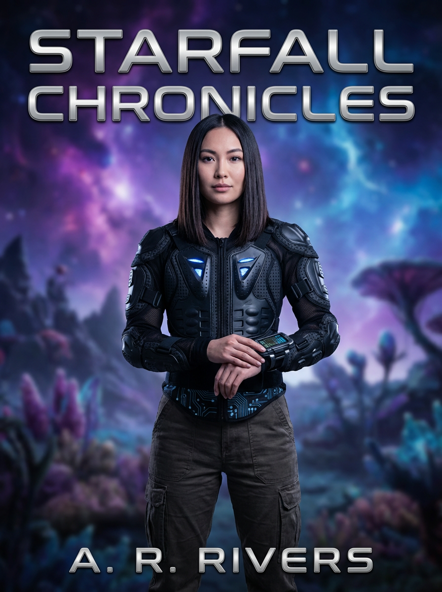 model as sci-fi book cover, futuristic styling, technological elements, otherworldly lighting