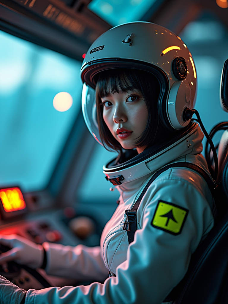 model as sci-fi pilot in a spaceship cockpit set, wearing a sleek space suit with neon accents and a helmet , dramatic lighting, space-themed props