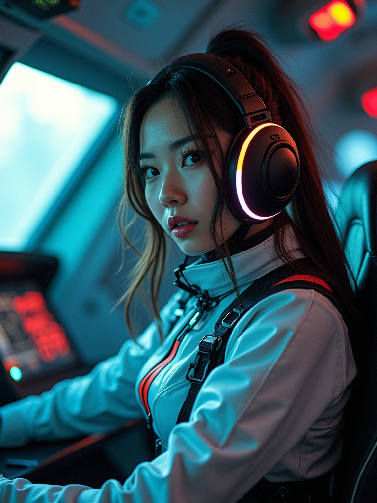 model as sci-fi pilot in a spaceship cockpit set, wearing a sleek space suit with neon accents and a helmet , dramatic lighting, space-themed props