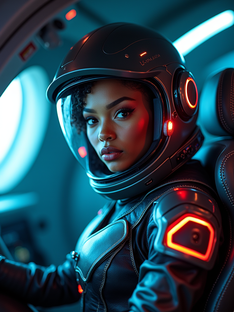 model as sci-fi pilot in a spaceship cockpit set, wearing a sleek space suit with neon accents and a helmet , dramatic lighting, space-themed props