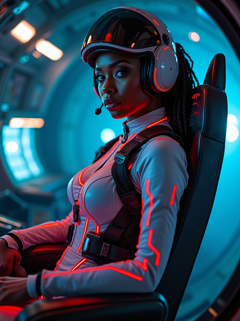 model as sci-fi pilot in a spaceship cockpit set, wearing a sleek space suit with neon accents and a helmet , dramatic lighting, space-themed props