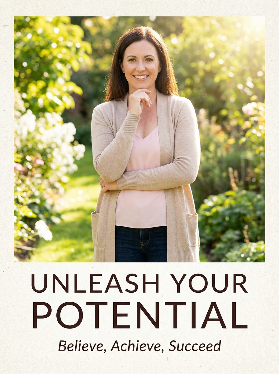 model as self-help book cover, confident inspiring pose, bright optimistic lighting, motivational energy