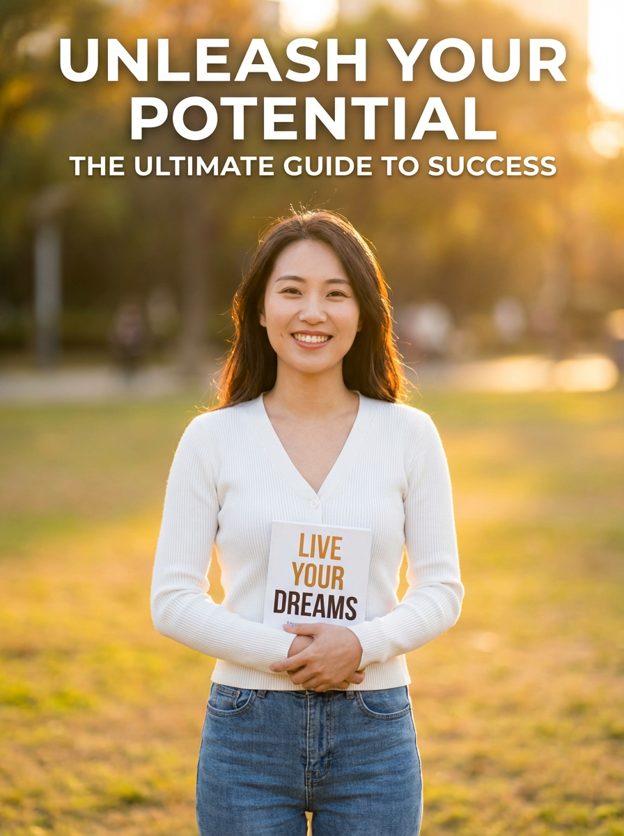model as self-help book cover, confident inspiring pose, bright optimistic lighting, motivational energy