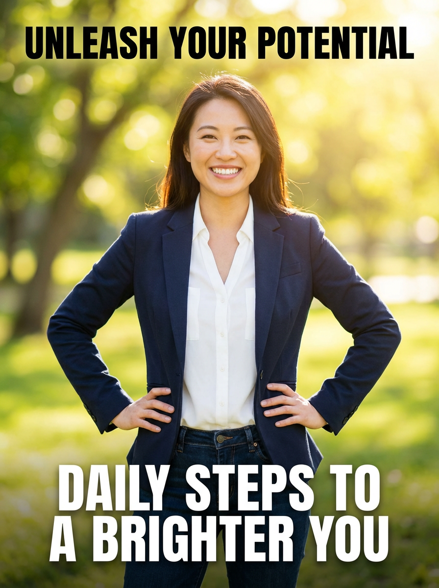 model as self-help book cover, confident inspiring pose, bright optimistic lighting, motivational energy