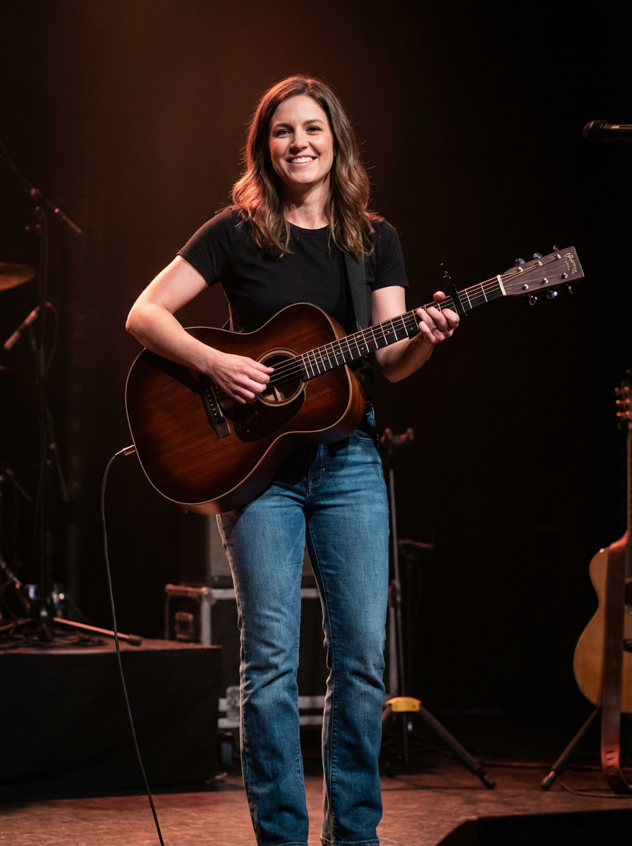 model as singer-songwriter, acoustic guitar in frame, intimate performance setting, warm stage lighting