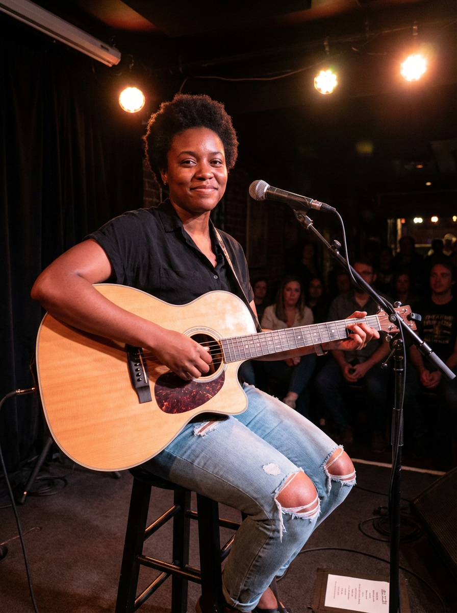 model as singer-songwriter, acoustic guitar in frame, intimate performance setting, warm stage lighting