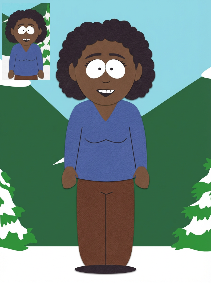 model as south park character, construction paper cutout style, simple shapes, iconic show aesthetic