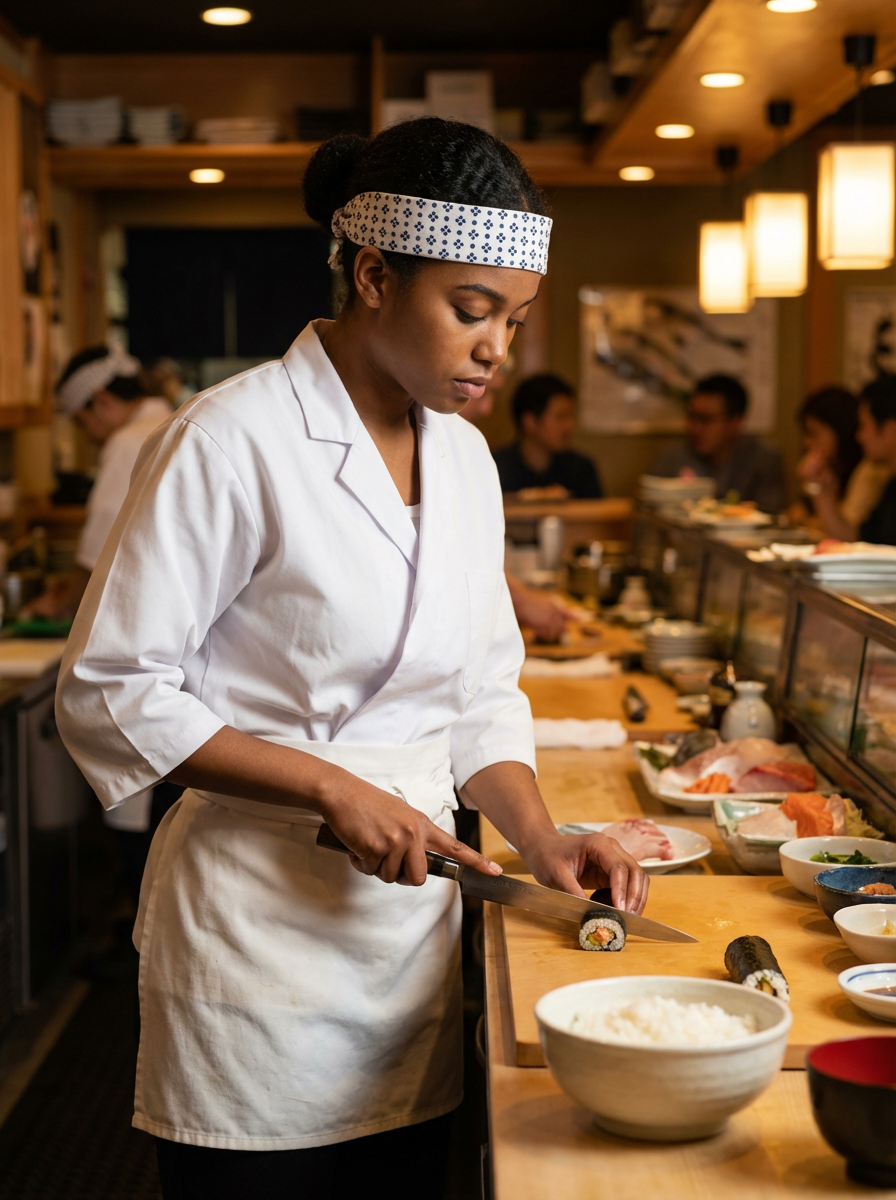 model as sushi chef, traditional Japanese chef attire, focused precise expression, sushi bar setting
