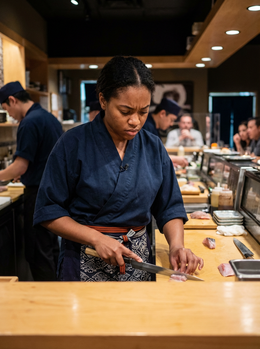 model as sushi chef, traditional Japanese chef attire, focused precise expression, sushi bar setting