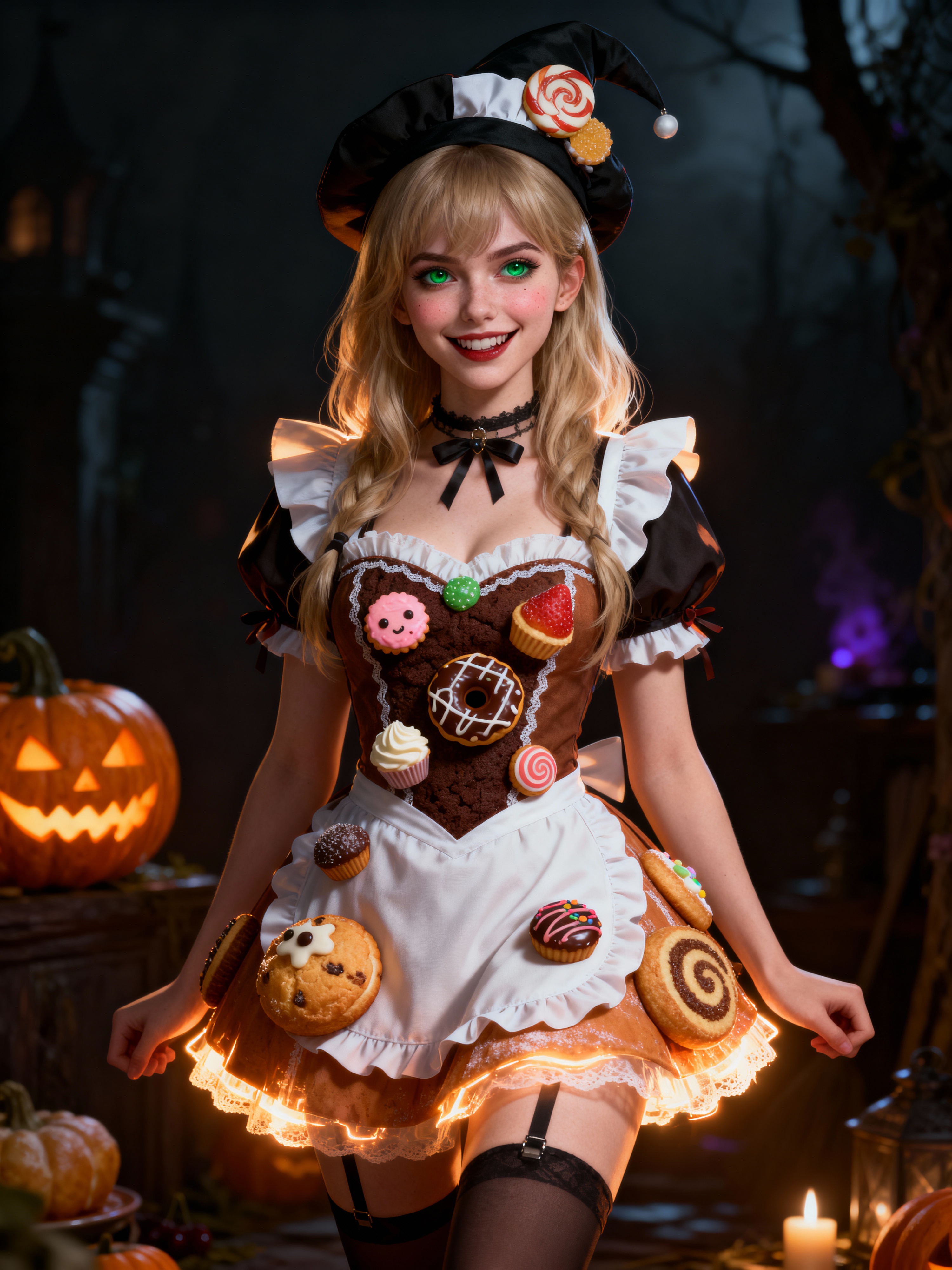 model as the personification of the Halloween holiday in the form of model with a villain's smile, (cute)cute hats, cute cheeks, unreal engine, highly detailed, artgerm digital illustration, woo tooth, deviantart, sharp focus, artstation, by Alexei Vinogradov bakery, sweets, emerald eyes