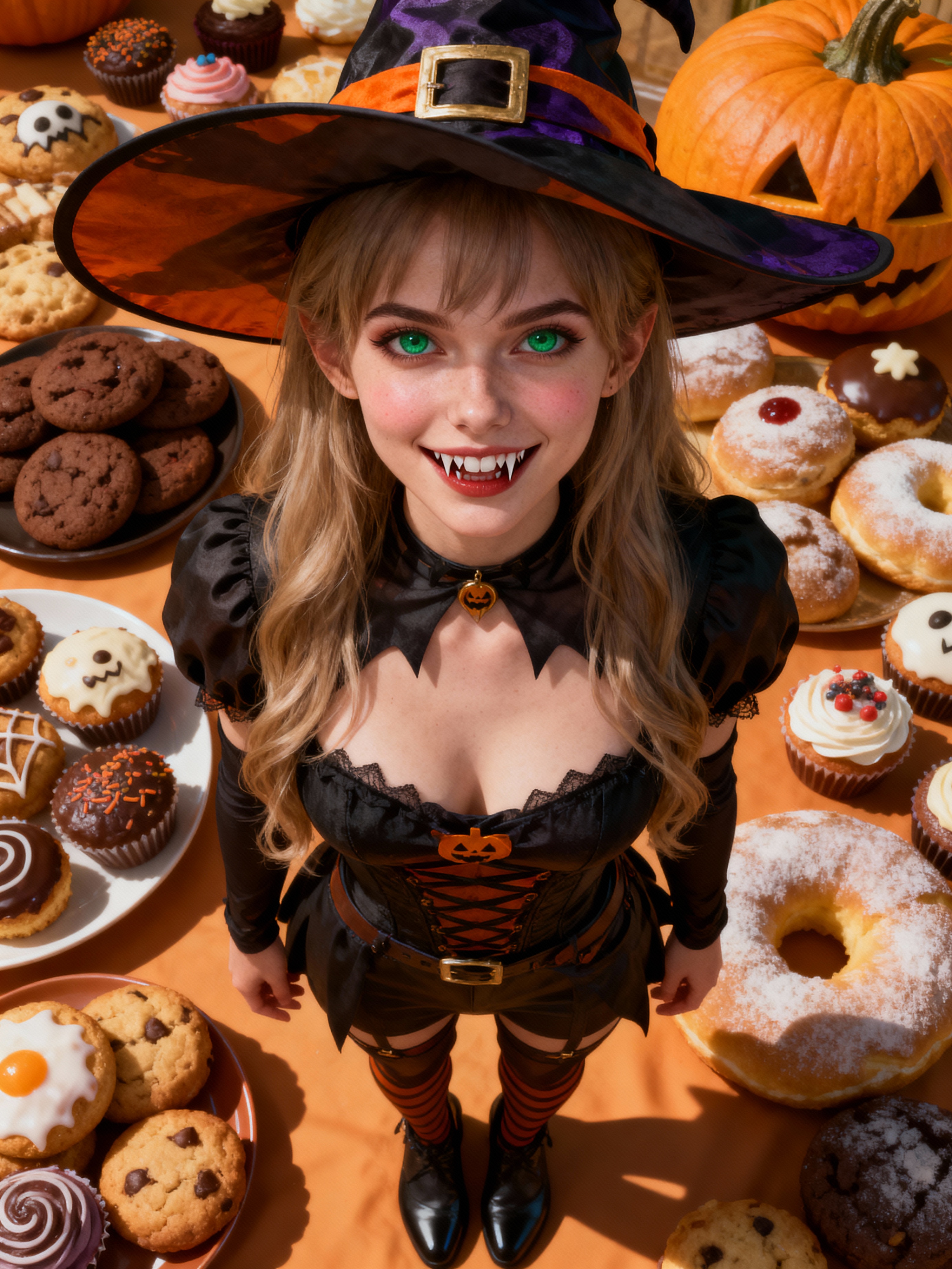 model as the personification of the Halloween holiday in the form of model with a villain's smile, (cute)cute hats, cute cheeks, unreal engine, highly detailed, artgerm digital illustration, woo tooth, deviantart, sharp focus, artstation, by Alexei Vinogradov bakery, sweets, emerald eyes