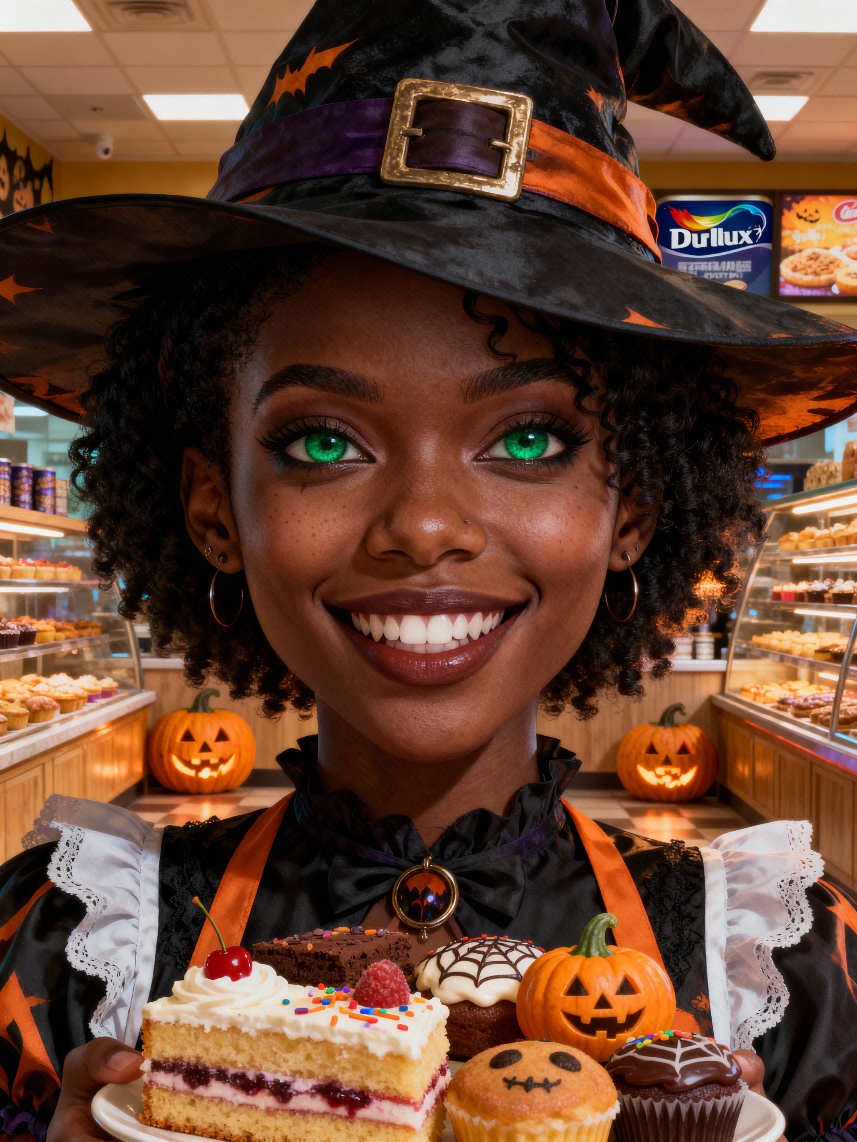 model as the personification of the Halloween holiday in the form of model with a villain's smile, (cute)cute hats, cute cheeks, unreal engine, highly detailed, artgerm digital illustration, woo tooth, deviantart, sharp focus, artstation, by Alexei Vinogradov bakery, sweets, emerald eyes