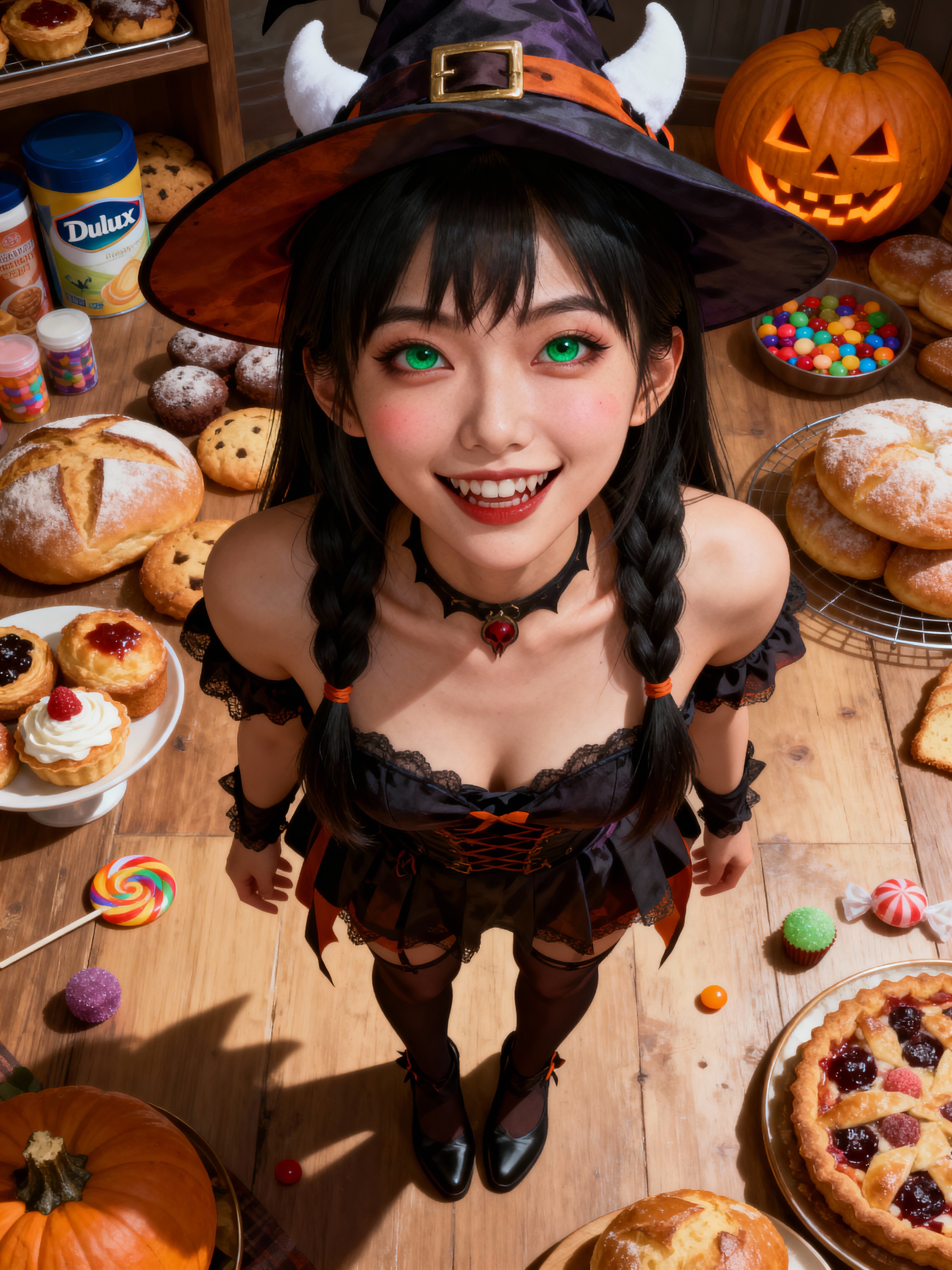 model as the personification of the Halloween holiday in the form of model with a villain's smile, (cute)cute hats, cute cheeks, unreal engine, highly detailed, artgerm digital illustration, woo tooth, deviantart, sharp focus, artstation, by Alexei Vinogradov bakery, sweets, emerald eyes