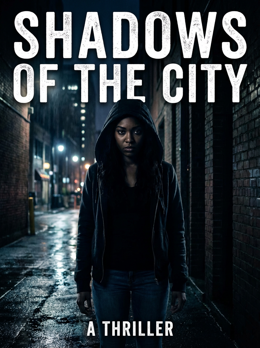 model as thriller book cover, intense gaze, mysterious shadows, urban night setting, suspenseful mood
