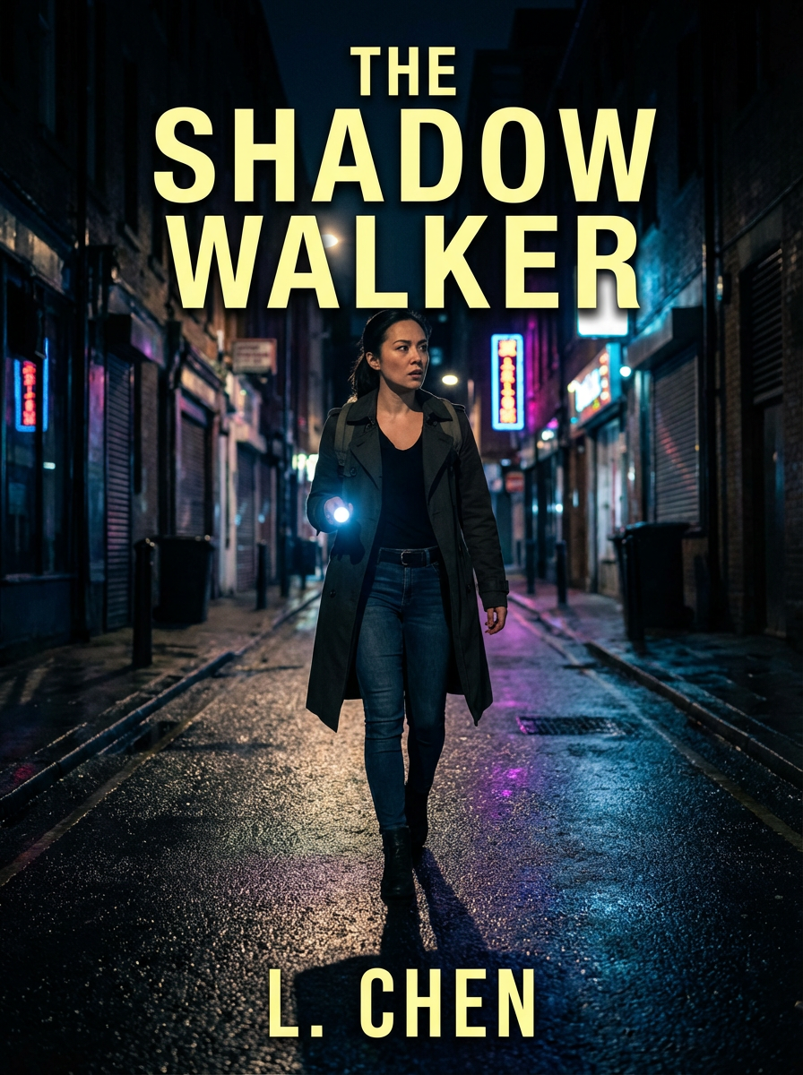 model as thriller book cover, intense gaze, mysterious shadows, urban night setting, suspenseful mood