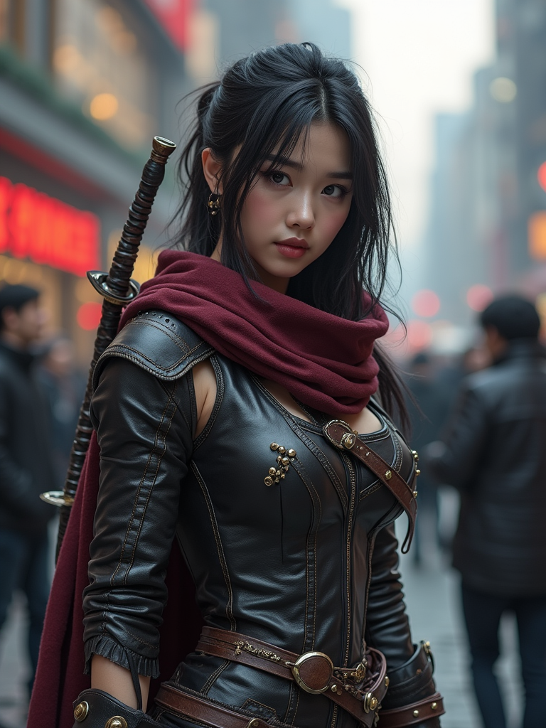 model as video game character, outdoors at a convention building, wearing a stealthy rogue outfit with tight leather and daggers , interacting with a crowd