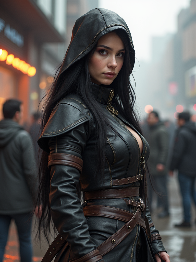 model as video game character, outdoors at a convention building, wearing a stealthy rogue outfit with tight leather and daggers , interacting with a crowd
