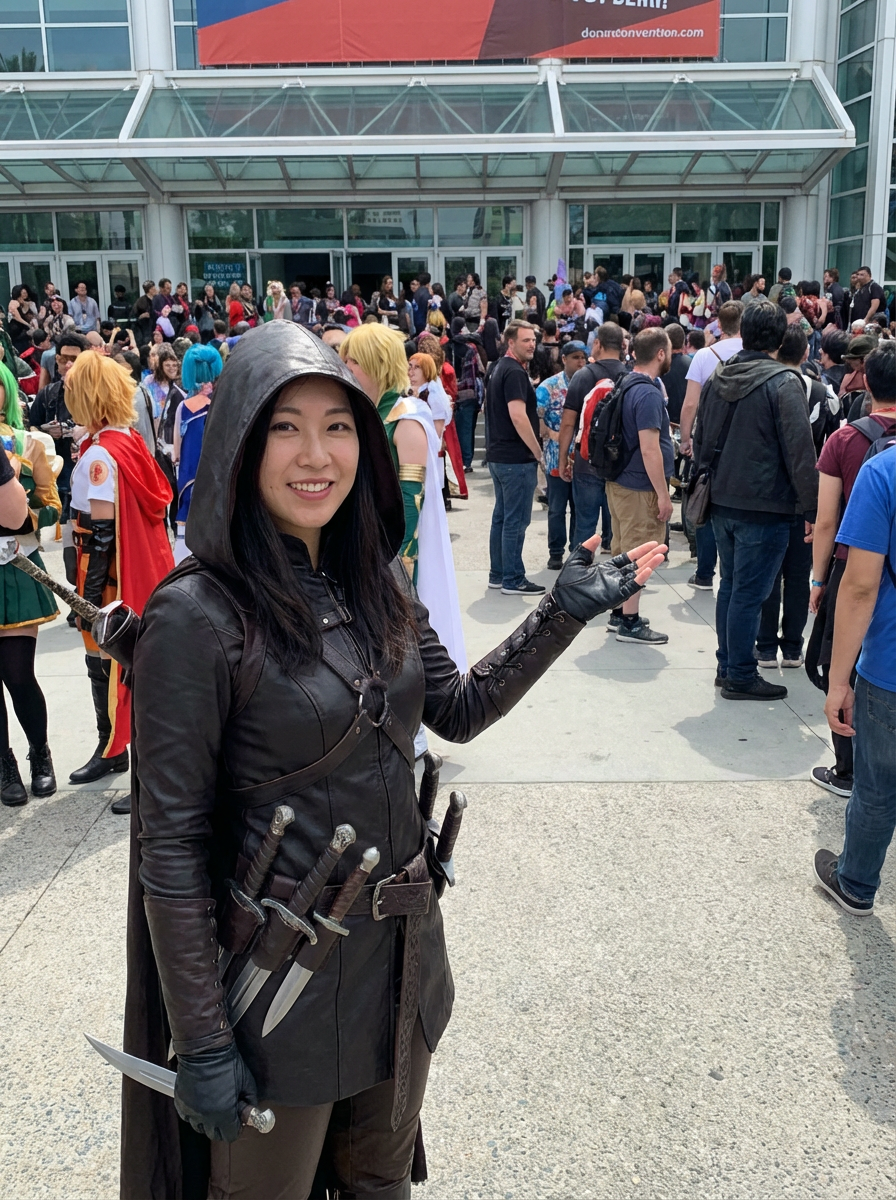 model as video game character, outdoors at a convention building, wearing a stealthy rogue outfit with tight leather and daggers , interacting with a crowd