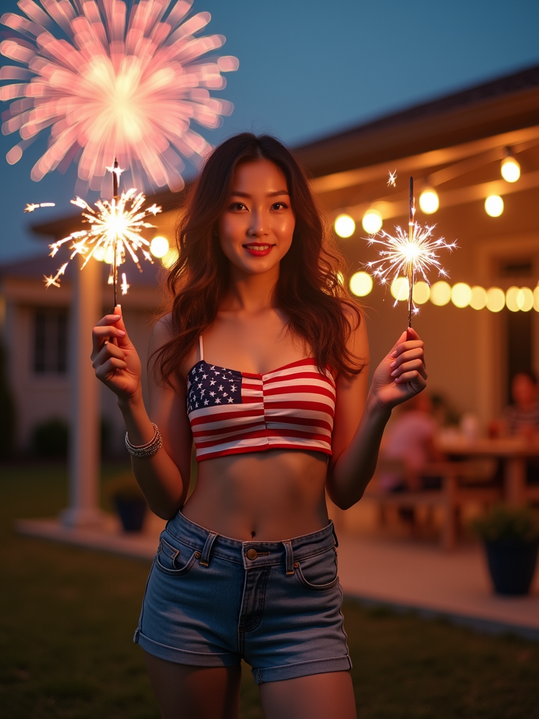 model at a 4th of July backyard barbecue, wearing a stars and stripes crop top and high-waisted blue shorts , holding sparklers and a small American flag, surrounded by patriotic decorations, fireworks bursting in the sky